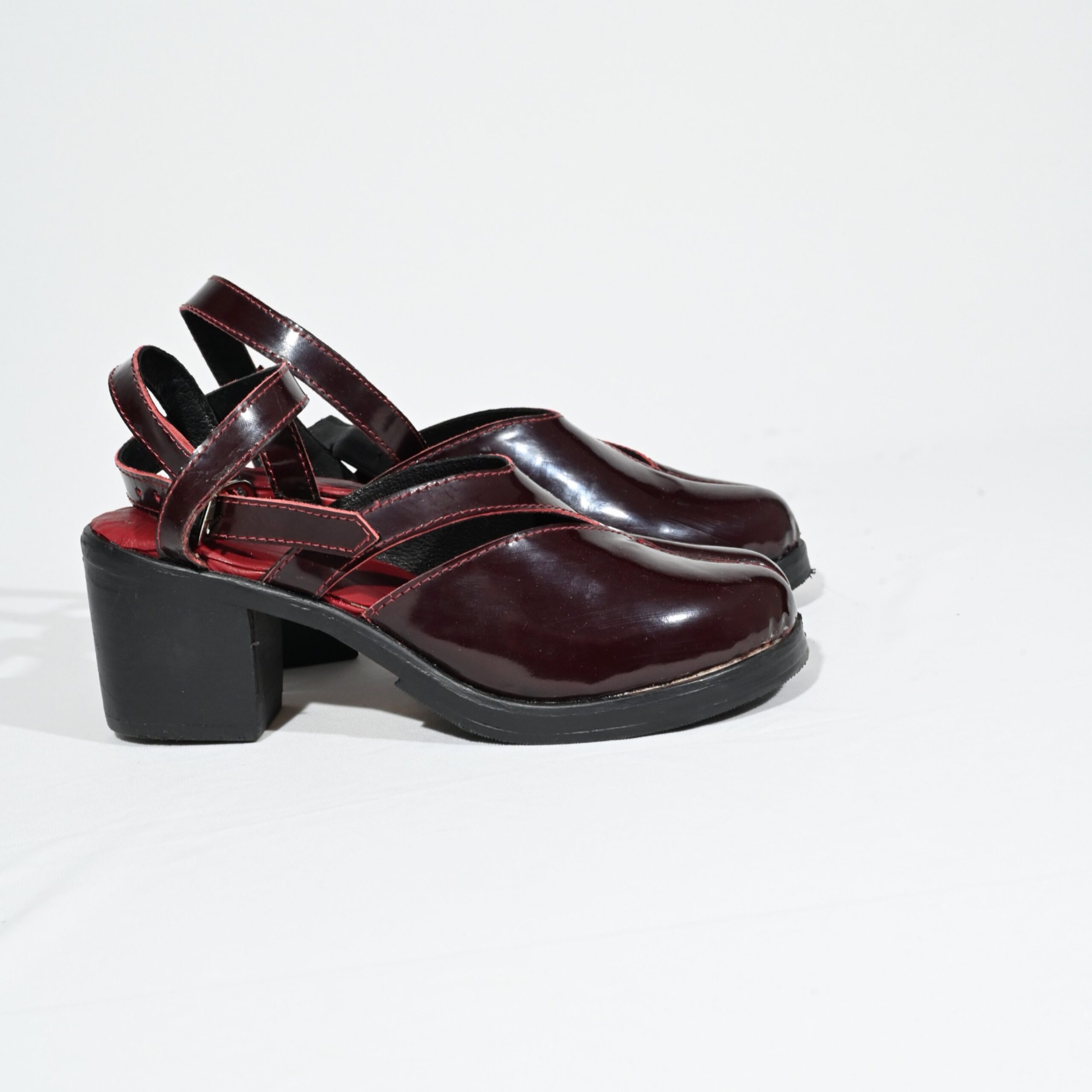 Shop luxury burgundy patent leather tabi sandals featuring a signature split toe design and block heel. Bold, comfortable, and fashion-forward footwear.