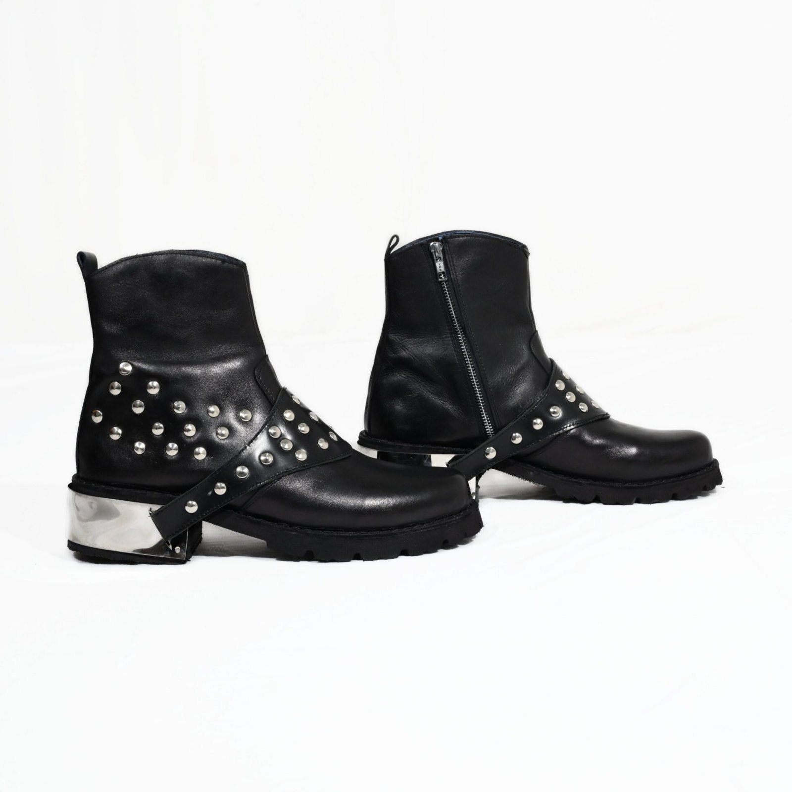 A definitive statement in rebel luxury, the Chrome Renegade combines high-fashion hardware with artisanal leatherwork. These boots are meticulously crafted from supple black genuine leather and adorned with polished silver-tone studs along the harness and quarters. Finished with a striking architectural chrome heel, this pair is designed for those who lead with confidence and a rock-and-roll spirit.