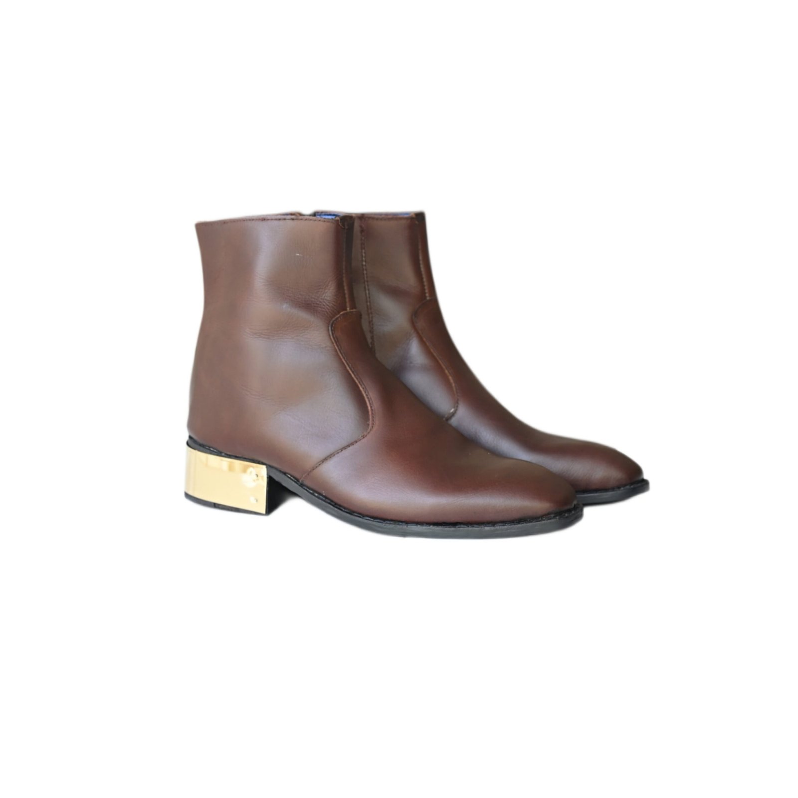 Elevate your footwear collection with these sleek, minimalist boots. Crafted from deep coffee-toned genuine leather, this pair features a smooth, refined finish and a clean silhouette. The standout architectural gold-tone heel adds a touch of modern luxury, making these the ideal choice for those who appreciate understated elegance with a bold, contemporary twist.